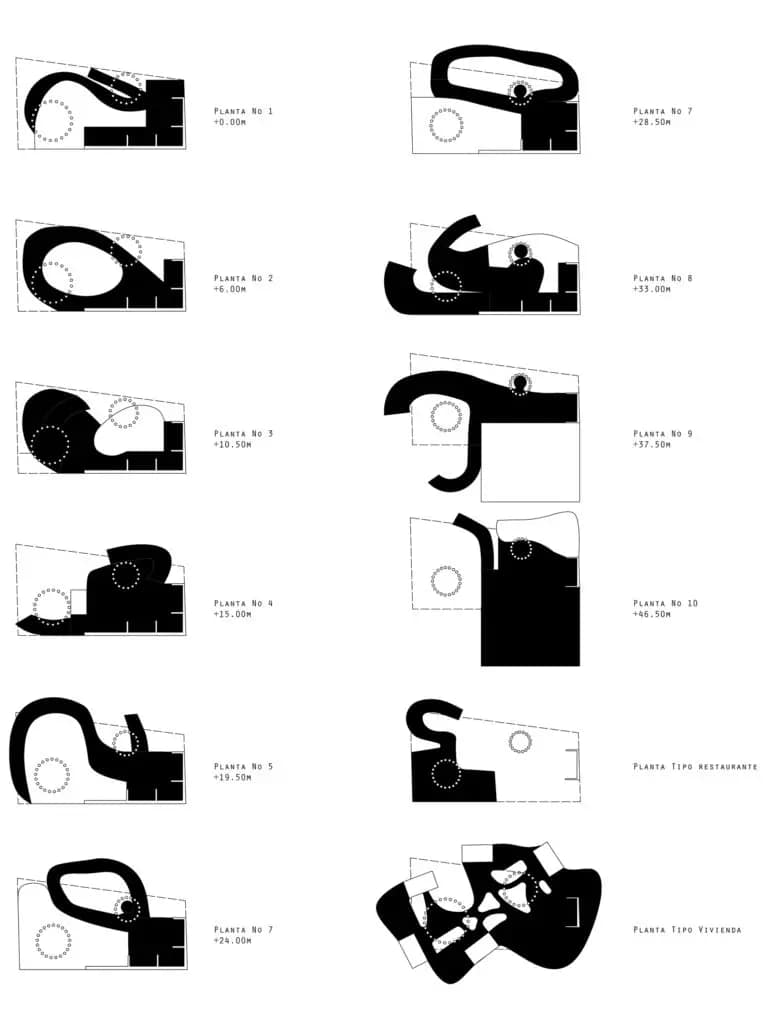 La forma en la que se aproxima a este concepto idílico de nubes arquitectónicas es por medio de inmensas columnas con una geometría hiperboloide lo cual les permite atravesar los espacios sin interrumpirlos. Por otro lado la forma de cada espacio esta pensada cómo un molde orgánico que se adapta al uso y la naturaleza de los movimientos del usuario según el programa.