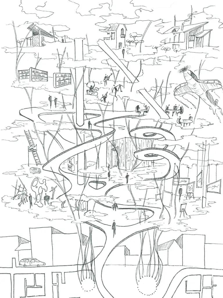 Busca una solución al cómo tener una estructura habitable, transparente. Mientras que la forma de cada espacio pueda flotar libremente, adaptándose o moldeándose a quien lo habita y su función.